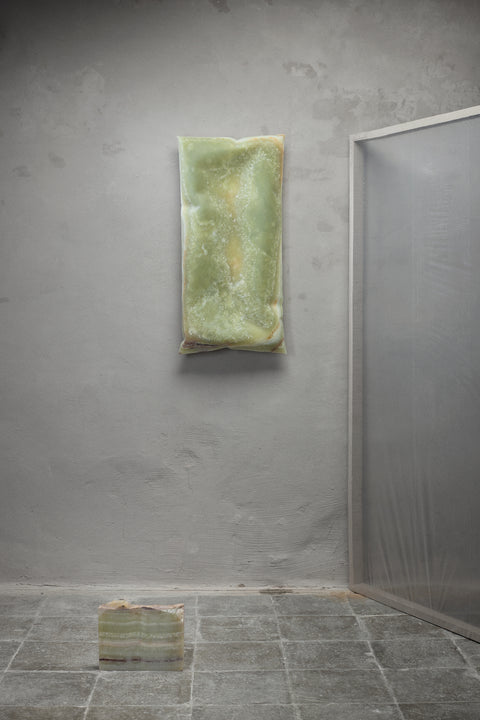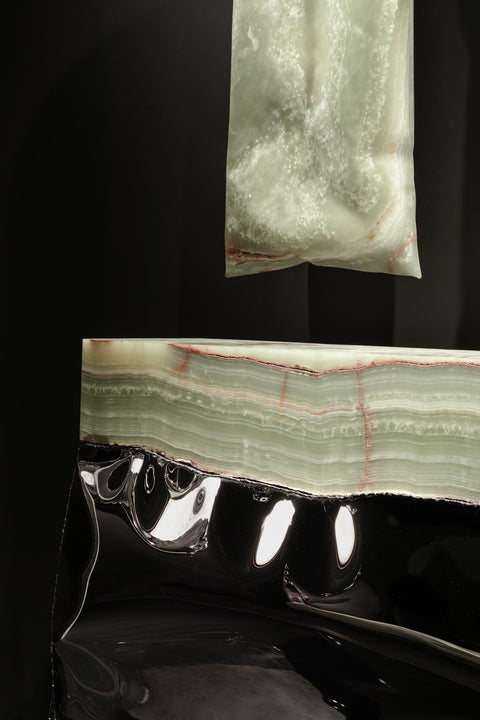 A layer of water covering the floors; the illusion of floating volumes and objects; as soon as one enters the setting, all sureness dissolves. As an allusion to a domestic interior, the scene seems at once recognisable and alien, captured in a moment that flows both forward and backwards, streams and trickles. In the designs themselves, the fluidity is addressed as a captivating interaction between states and qualities. Forms seem frozen in a process of transformation, a flow that is suspended but promises to continue. Glass appears to be stone, then water, a liquid that has solidified but retains an aquatic resemblance. Onyx alludes to the processes of aeons of seeping water and minerals, sediments that echo the currents that shaped them.