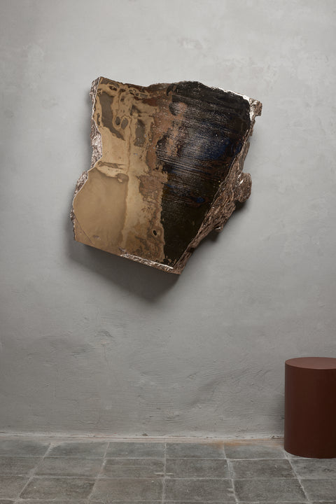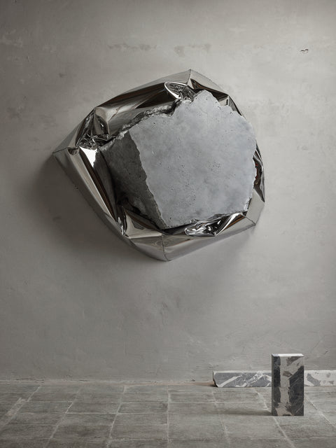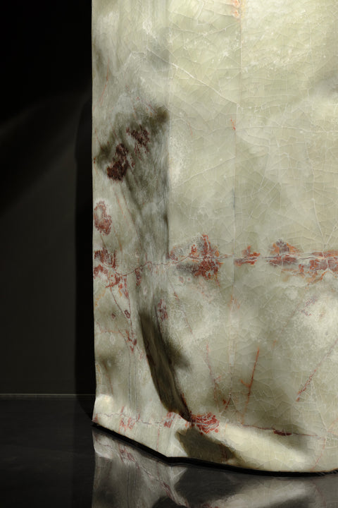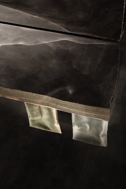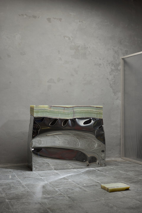 From consoles to wall pieces, coffee tables and room dividers, the selected designs have been chosen for their conceptual coherence. A new series called Crushed - a variation on Ben's well-known In Hale series - starts with sheets of metal welded together to form a transitory shape, which is then transformed under intense pressure in a fluid, almost intuitive process. There are pieces in glass and marble, contrasts between solid stone and seemingly airy volumes in steel and aluminium. The cast glass, which complements the marble volumes of earlier series, has been cooled for weeks in a controlled manner, revealing a near-transparent quality that redefines massiveness and solidity. Pieces in Onyx (new in the curation of materials in the work of Ben Storms) contribute to the definition of the palette, enhancing the matte, inner glow of the glass and speak of eternity.