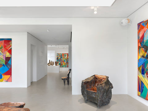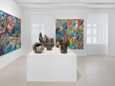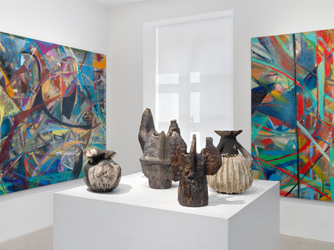 Spanning the gallery’s three distinct rooms, the exhibition traces the intersections between fine art, sculpture and design through a shared reverence for materiality, process, and architectural influence. Each artist engages deeply with organic forms and natural materials—whether through hand-molded ceramics, sculptural metalwork, fluid vessels, or layered brushwork— foregrounding the tactile and the elemental.