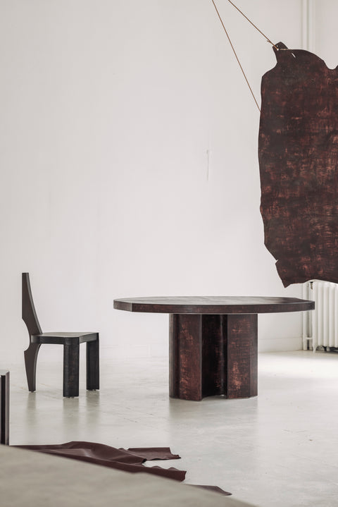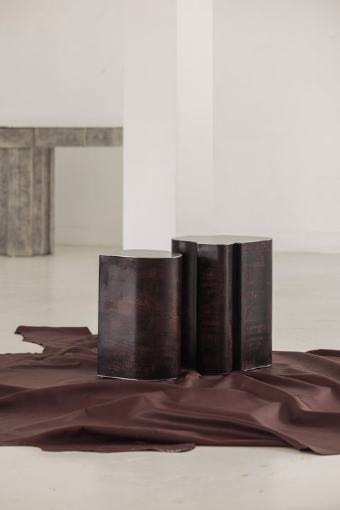 My creations are monolithic, organic, and classical in form, sculptural in presence. They embody a contrast between the warm, tactile nature of leather and the industrial edge of steel, celebrating both the primal and the refined. The process is intuitive, where I allow the material to guide me, responding to the inherent energy of each piece.