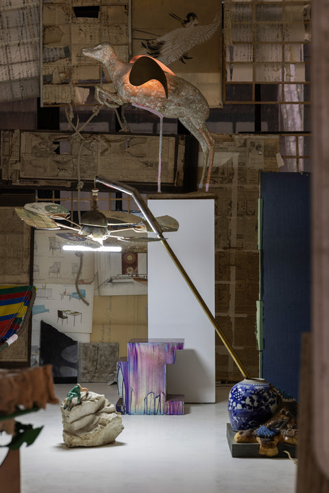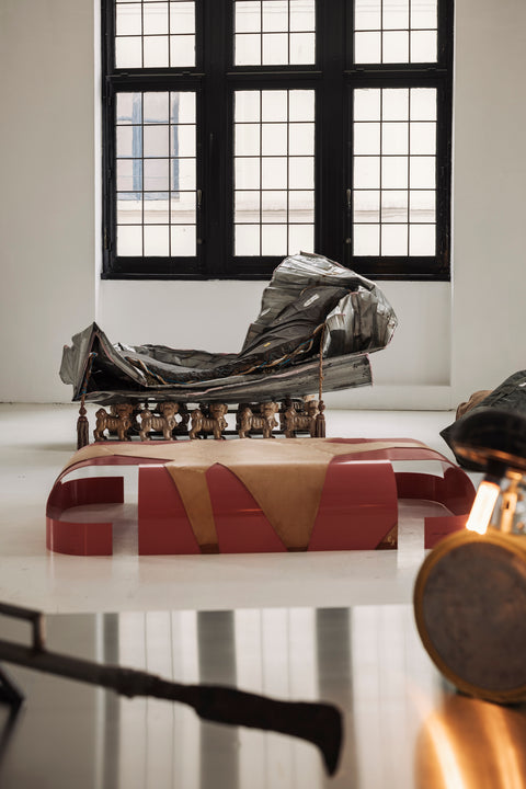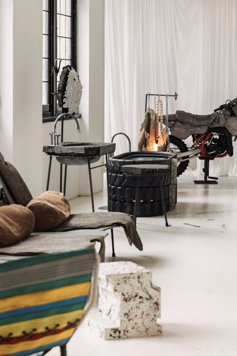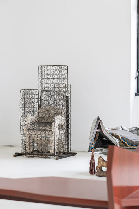 Working from a near photographic mental library of materials and influences, he is at once artist, tinkerer, and inventor. He explains, “What interests me is ideas passing though memory, and the influences mixing. Culture meeting subculture, mixing genre – from memory. I filled notebooks of ideas and with this approach I decided to achieve all that was in my notebooks. It is an exciting job; it’s more an expression, free of any constraints. But it is also a free reflection on design and art, and this fragile border that I love to cross in both directions.”