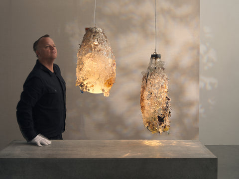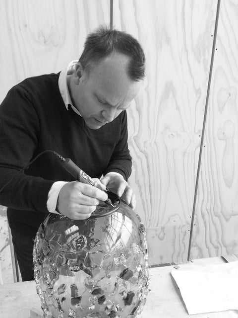 The success of these pieces lies in the crystalline clarity posed against their substantial physical impact. To create each piece, a meticulously patterned bed of broken glass pieces is strategically laid down and heated to a specific temperature in order to be properly fused to a nascent blown glass form. The temperature and timing must be precisely in tandem. It is a high-stakes process that results in a kind of frozen sense of chaos.