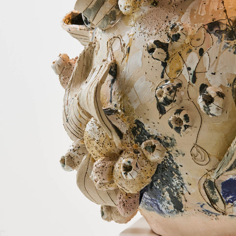 Vrolijk is perhaps best known for glass vessels with their outgrowth of colored glass fragments. The volatility in accomplishing the exceptional thickness of his vases creates a risky balance between strength and delicacy. The thermal stress caused when trying to equalize the interior and exterior temperature of the cooling vessels, is fraught with the threat of breakage.