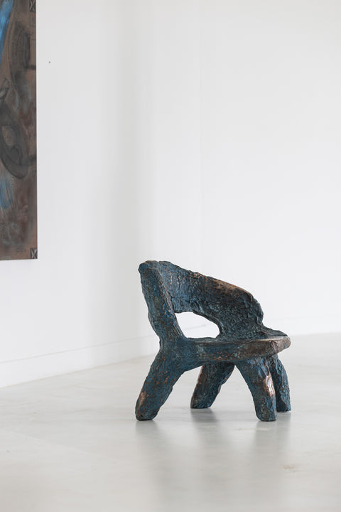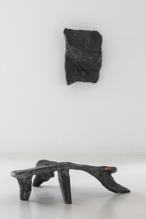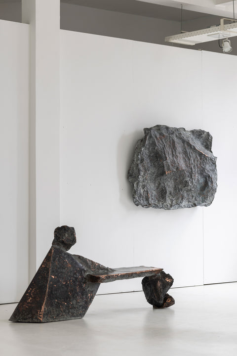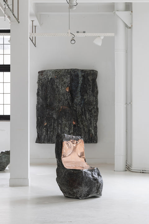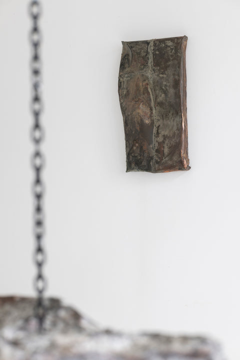 He's been working a lot with copper, copper being the physical material that connects the world. Its incorporation into technology (communication, transport) has enabled and increased the mobility of ideas, goods, and people, impacting the nature and physicality of borders. It has become important to his work for both its physical and philosophical characteristics. In the classical world, alchemy associated seven metals with the planets (silver/Moon, mercury/Mercury, copper/Venus, gold/Sun, iron/Mars, tin/Jupiter, lead/Saturn). As one of these materials, copper has a direct association both with human history and the cosmos. He is using a technique called Repoussé, which does not require a highly equipped studio; rather it is more of a nomadic technique that he can use wherever he goes, well-suited to his nomadic lifestyle.