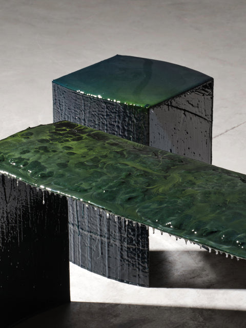 Each piece is finished with a unique combination of epoxy and pigments, making each artwork unique due to the unregistered mix of materials used.